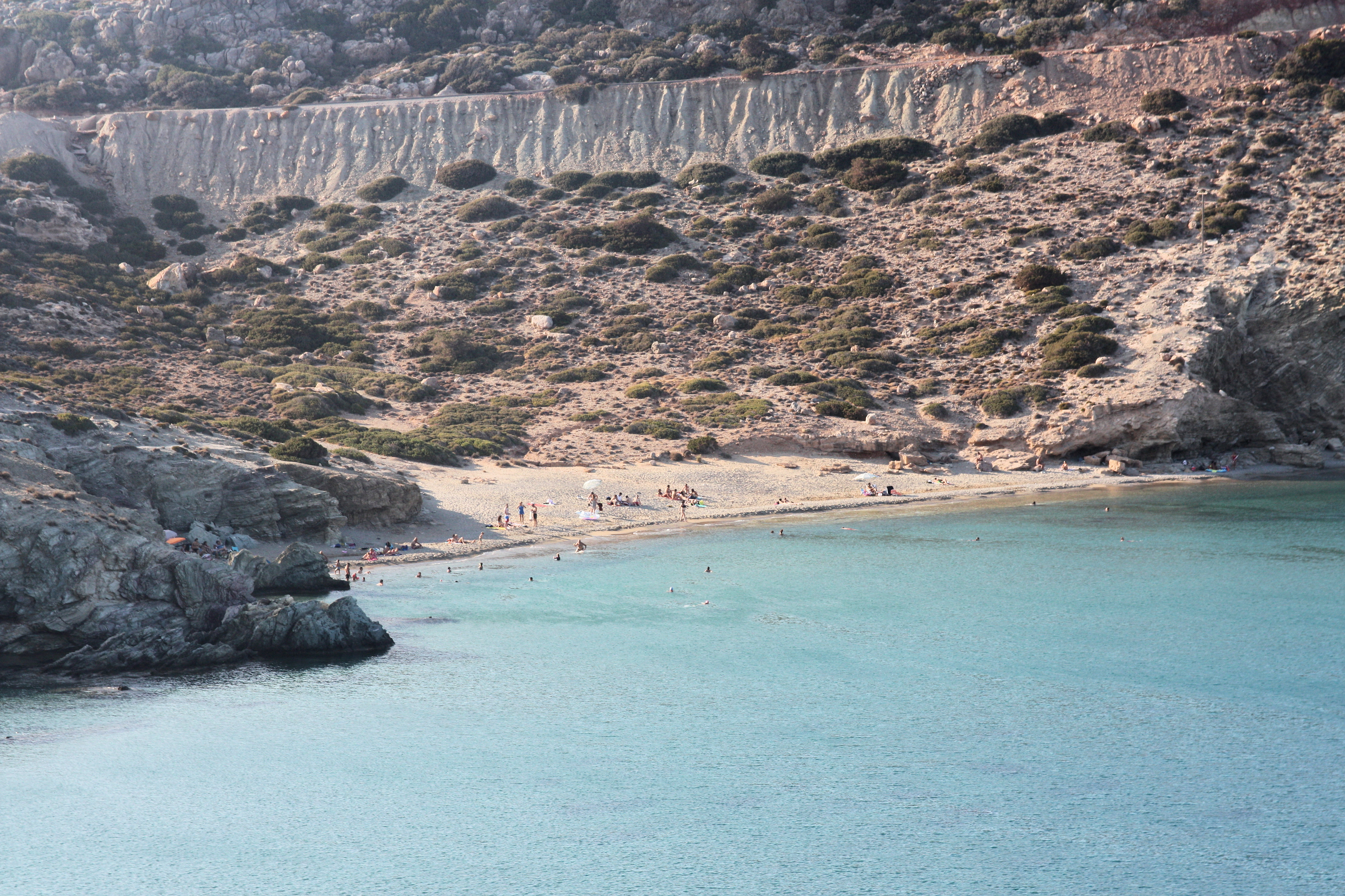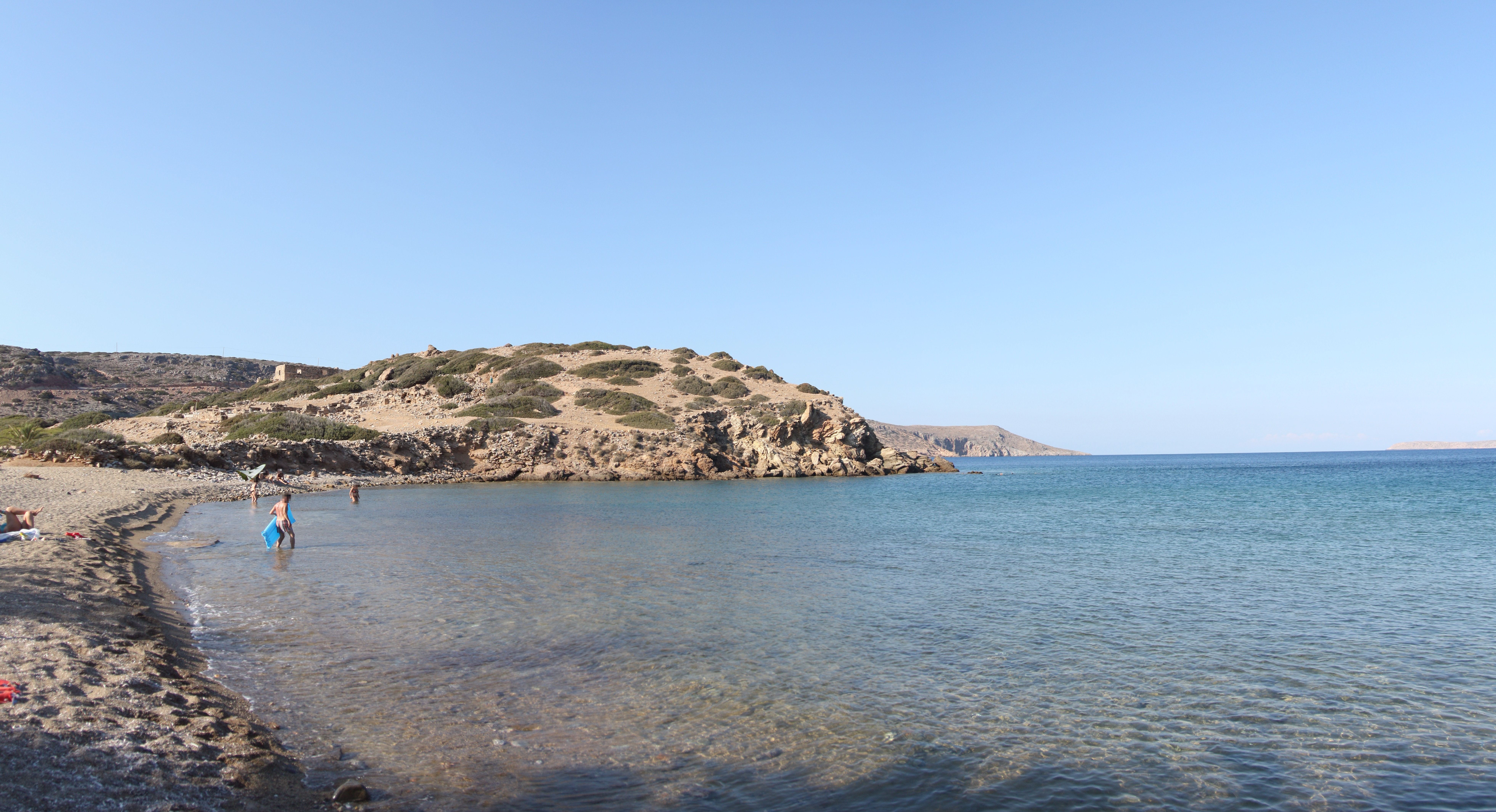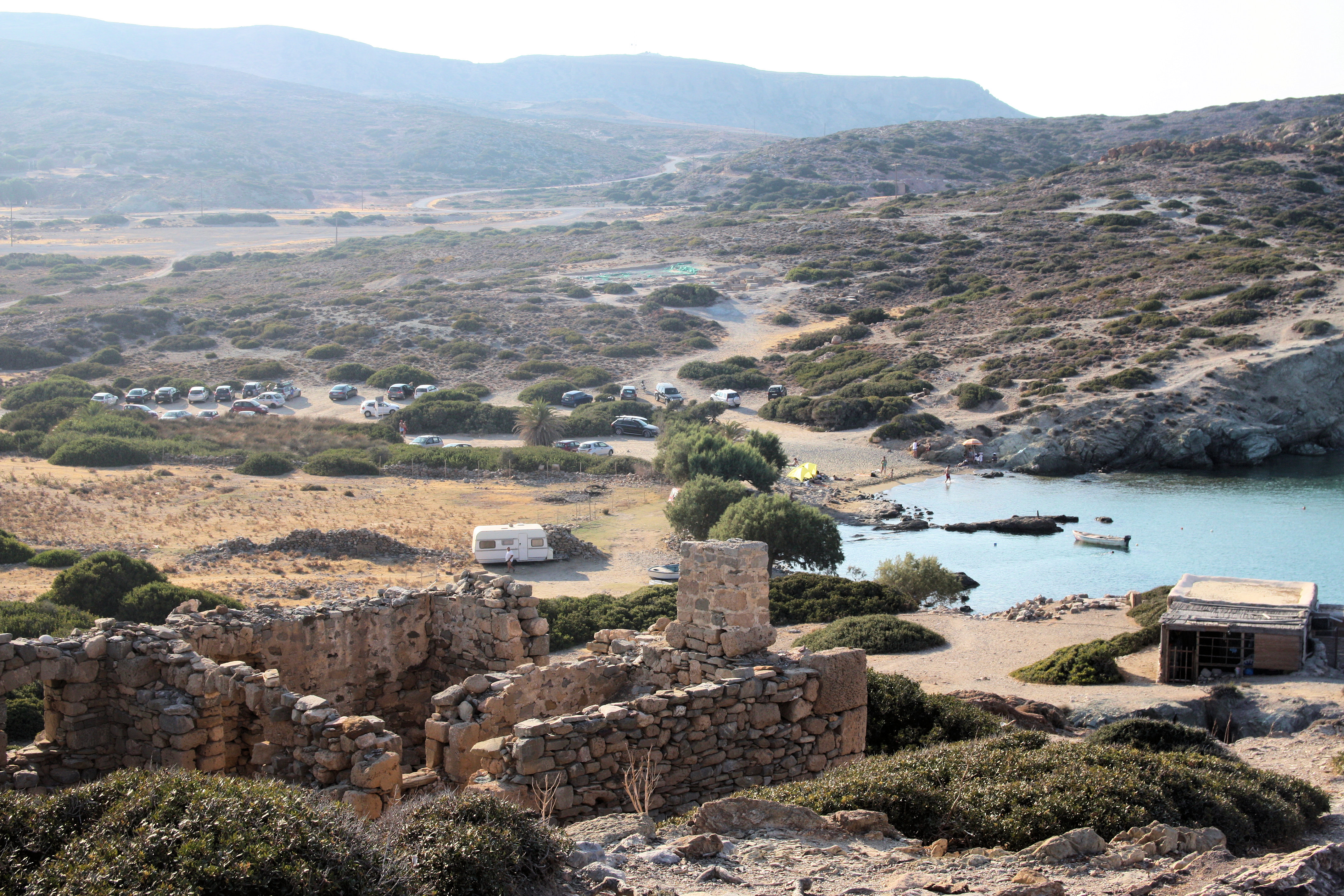 Itanos usually has a number of people there but it doesn’t get especially busy so it’s perfect for people who like a peaceful beach. 马路, and the informal carpark at the end of it, 导致中间 3 beaches which is the smallest, which is barely a beach at all really. The largest beach, also known as Erimoupolis beach is immediately to the north of the central beach and is the most popular. The southern beach is a short 250m walk, 越过古镇的废墟. Unlike a lot of beaches on Crete, 所有 3 beaches at Itanos are sandy, and the water is beautifully clear. There are pictures of all 3 在画廊