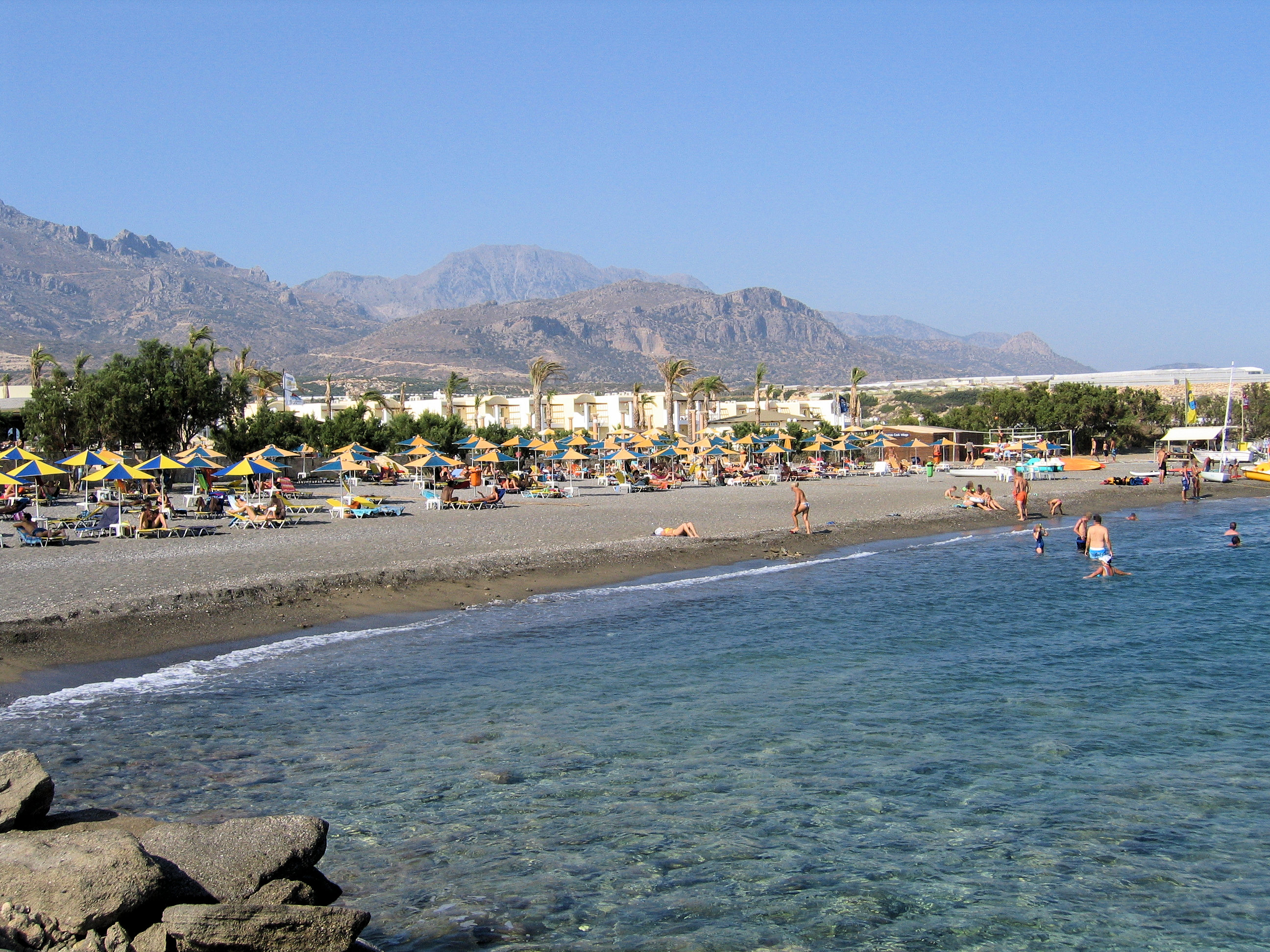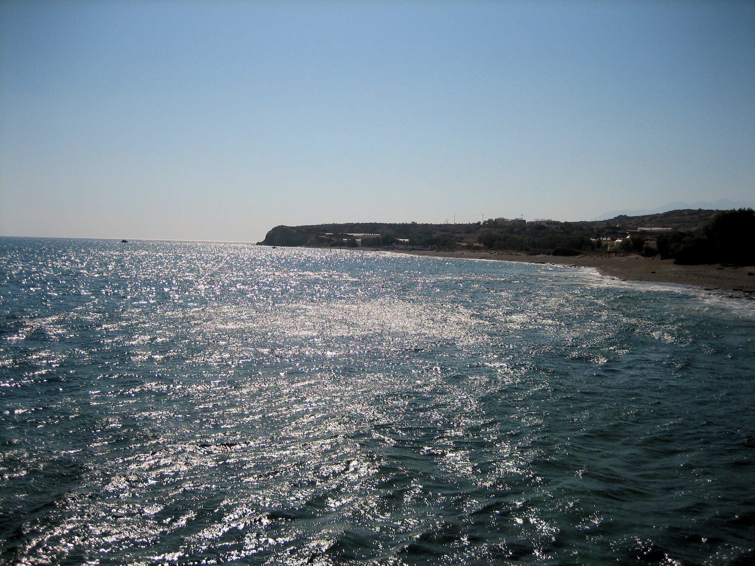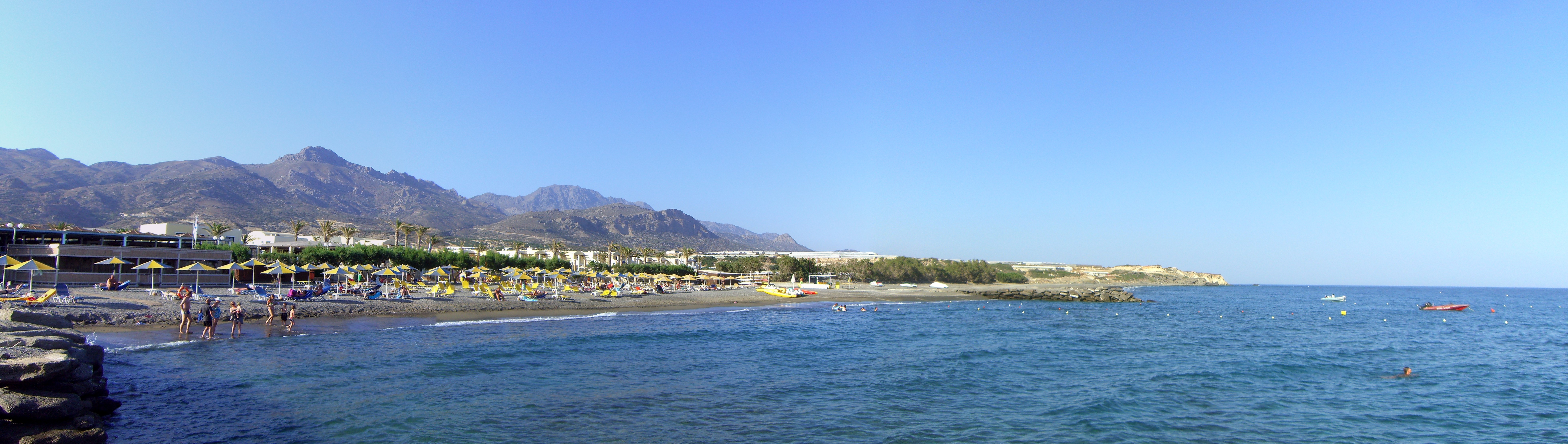 Der Strand hat vernünftig weichen Sand, obwohl es wie bei vielen auf Kreta eher groben Sand als feinen goldenen Sand gibt. Dies ist gut für die Wasserqualität, da der gröbere Sand nicht so leicht durch Strömungen gestört wird und das Wasser normalerweise sehr klar ist. Das Schnorcheln ist ziemlich gut. Da sich der Sand im Laufe der Jahre verschoben hat und einige der natürlichen Felsvorsprünge bedeckt hat, ist die Zahl der Meereslebewesen zurückgegangen. In den letzten zwei bis drei Jahren hat jedoch eine Erholung eingesetzt. Neben zahlreichen Fischen habe ich auch Aale gesehen, Tintenfisch, und einmal ein Rotfeuerfisch.